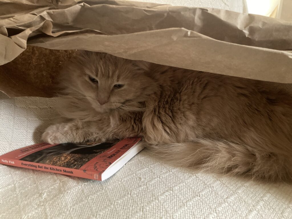 I didn’t have a clear enough photo of my own for Everything But the Kitchen Skunk, but luckily Pascale from our cutting-edge local organic news organization Yubanet raised her hand to offer up several. Feral skunks like to eat the birdseed cast off by sloppy avians under her feeders. The covergirl of book five is named Mama.